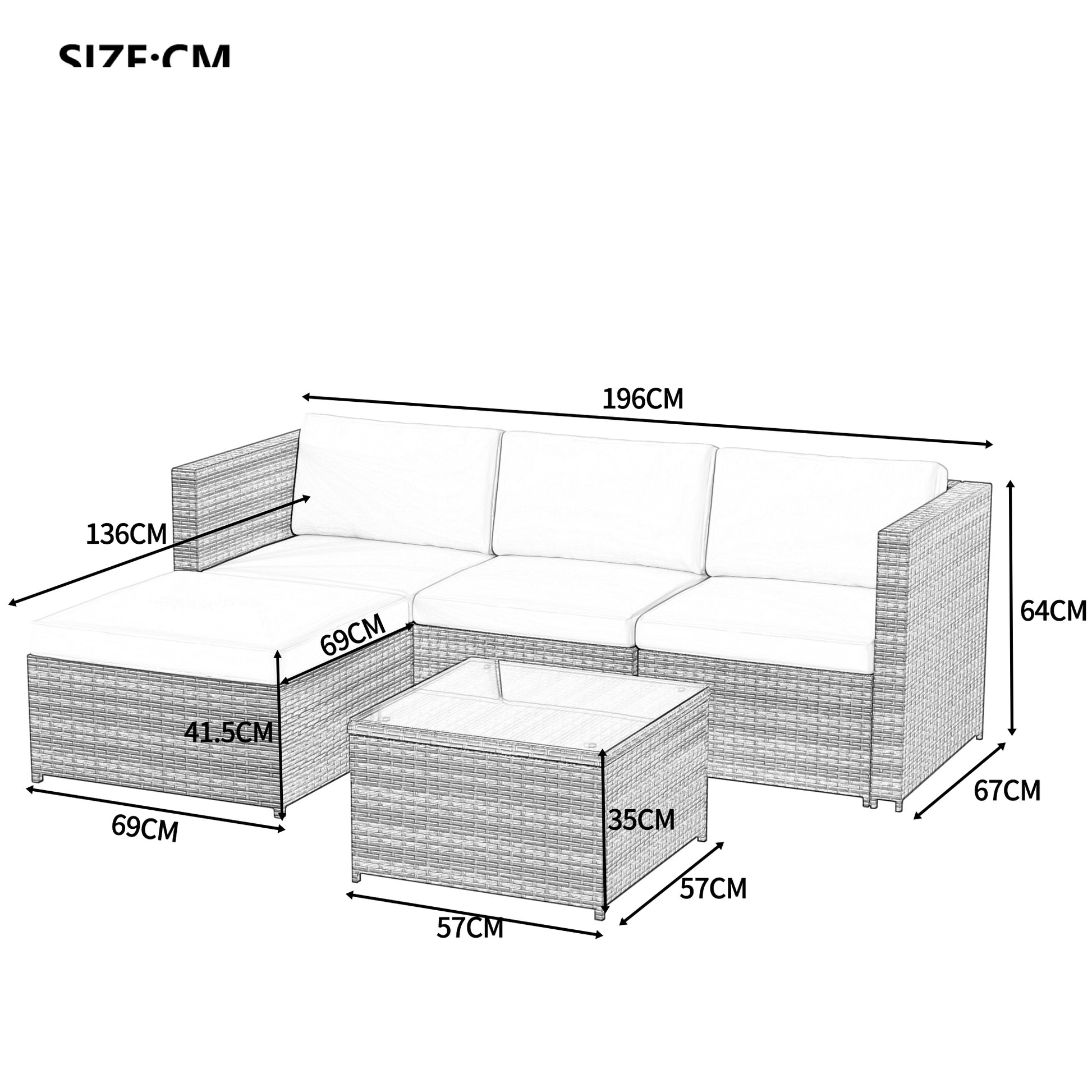 3-seater sofa: L196*W67*H64cm Stool: L69*W69*H41.5cm Coffee table: L57*W57*H35cm |