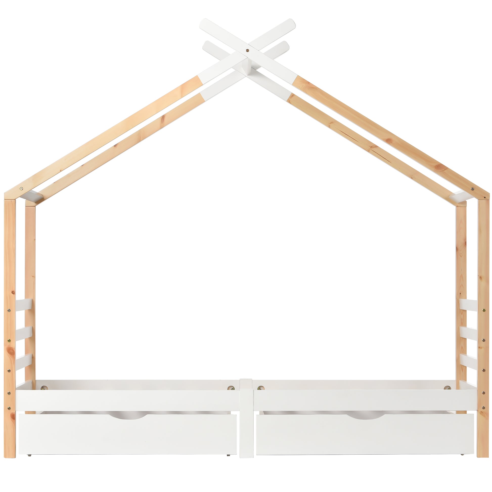 Wooden Single Cabin Bed, House Bed with Two Storage Drawers, Playhouse Bed with Roof for Children Girls and Boys, 190*90 in Natural and White, Easy Assembly