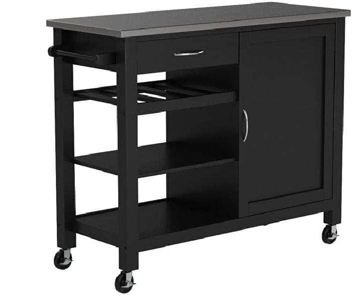 Romance : Our Ottawa kitchen island covers your need for storage and more. This multifunctional kitchen cabinet is a freestanding island that features four wheels for legs, each with a locking feature so it doesn't slip away while you are chopping fresh herbs and veggies. A towel bar, cabinet with concealed shelf, wine rack shelf, and two open shelves provide plentiful space for cookware, non-perishables, and sundries. The frame is made with black finish, and topping this is a beautiful stainless steel countertop. Some Assembly Required.