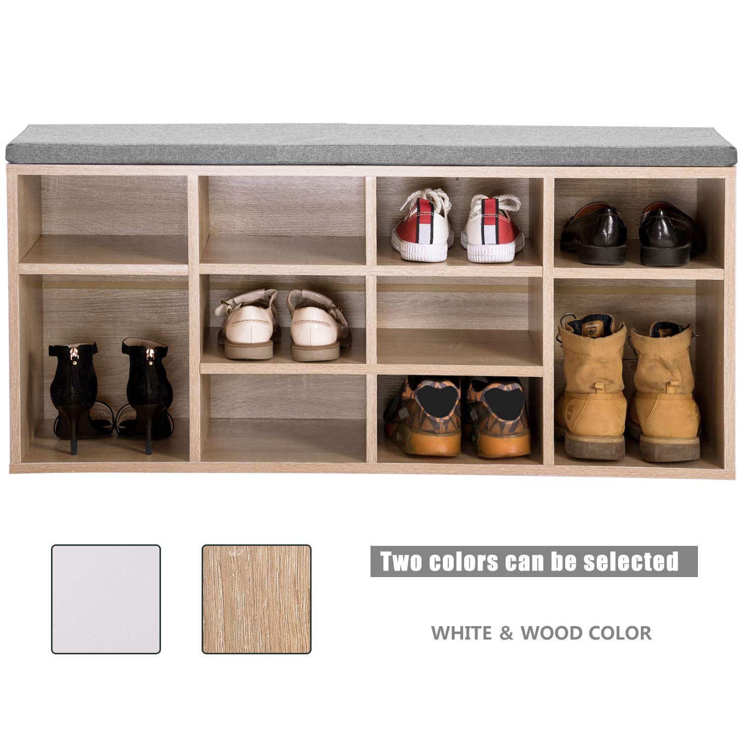 Wooden Shoe Bench Storage Shoe Cabinet Rack Hallway Cupboard Organizer with Seat Cushion 104 x 30 x 48 cm(W x D x H) (Natural, 10-Grids)